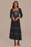 So pretty and femme, this maxi dress is featured in a longline tiered silhouette with 3/4 sleeves and embroidered flowers throughout for the perfect, effortless look.