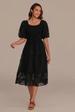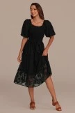 Our Black Floral Textured Short Puff Sleeve Square Neck Smocked Tiered Midi Dress will go with almost anything! You can wear it to work or to a nice dinner party with your friends! It features a smocked bodice, ruffle accent squared neckline, short puff sleeves, and a tiered skirt.