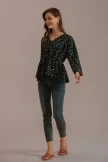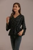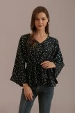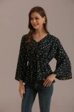 This black blouse has a unique floral design. The neckline is designed with a V-neck, and the sleeves are designed with flared sleeves, which naturally connect with the hem. The overall look is elegant and elegant. Goes well with trousers and skirts.