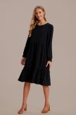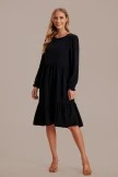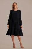 A solid hued dress featuring pleated puff sleeves, a tiered skirt, a ruffle hem, a rounded neckline and a back keyhole cutout with a button closure.
