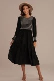 So pretty and femme, this maxi dress is featured in a longline tiered silhouette with oversized puff sleeves, keyhole back and embroidered stripes for the perfect, effortless look.