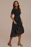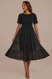 This lace dress features short sleeves, stretchy elastic waistband, cute ruffle neck + delicate lace design. Paired with your favorite shoes, this dress is the perfect everyday option.