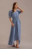 This lovely dress features elastic ruffle cuffs, V-neckline, smocked at waist, and best of all you can find one for your mini-me! This dress boasts blue color with off white floral print and flowy material. We love this dress for any occasion and know you will too!