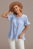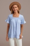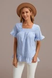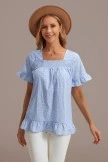 Wear our ruffled blue top for an effortless summer look! This sleeveless top is featured in a low-profile, gathered square neckline and ruffle detailing at the cuffs and bottom in a relaxed silhouette. You can style it with denim jeans and some cute heels or open toed slide sandals to complete the outfit!