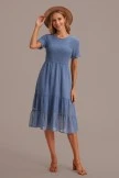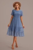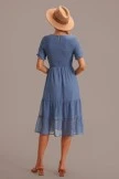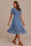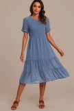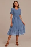 The upper body of this dress is full of pleats, the sleeves are with wooden ears, the neckline is a round neck design, and there is a button on the back of the neckline. The hem is also layered, we’re sure you’ll look great on it.
