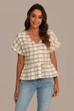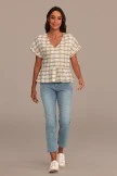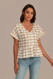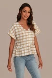 Our Brown Plaid Top is a wardrobe staple that gives you endless styling possibilities! Features include V neckline, loose hem. Choose the style with a slight roll up at the front and pair it with our white high-rise slim-fit straight-leg jeans and slippers for the perfect look!