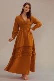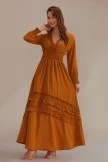 The Dress is all things beauty and grace. With a Self-tie back detail that adds boho flair, 3/4 sleeves with smocked cuffs, and beautiful camel color, this dress is guaranteed to win your heart!