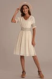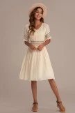 Cream colored midi dress with embroidery detail and smocking around the waist and sleeves, v-neck which really makes the dress pop. Easy pullover style.