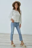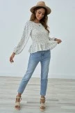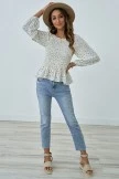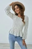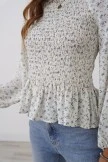 Smocked floral print top. Square neckline with elastic. Ruffle neck detail. Smocked wrist and chest detail.