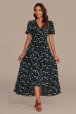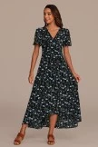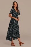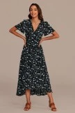The dress with faux wrap silhouette, v neckline, flutter sleeve and ruffle detail, and the perfect length. Perfect to wear on a Sunday or to the office. Pair with a cute pair of sandals in summer and transition to winter with booties and a sweater over top. This dress is versatile and just lovely!