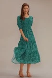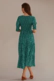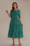 Add a ditsy print midi dress to your closet today. With a round neck, a smocked bodice, short puff sleeves and a tiered flared skirt sitting below the knee. Style with heeled wedges for a comfortable smart casual daytime outfit.