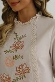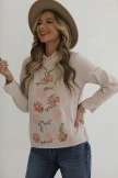 The Floral Embroidered Blouse features a 3/4 length sleeve, raised ruched neckline, rounded hems and fitted bodice. Rust, orange and green open embroidered florals against a cozy tan shade makes this top stand out! Pair with neutrals for a classic look.