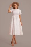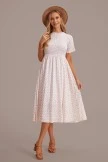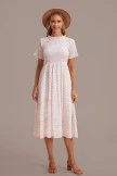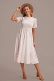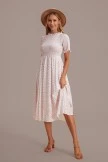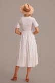 This is the perfect tropical vacation dress! Just imagine yourself on white sand beaches in this lovely piece. It features a high neckline, ruched bodice and ruffle detail and neckline and arm. Dainty florals really make this dress come alive!