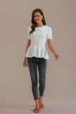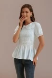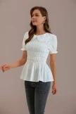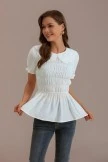This top has a unique design with a round neckline and a specially designed collar. The overall fabric is also designed with a little pleats, and the hem is naturally elegant. Perfect with shorts, skirts, and jeans.