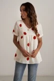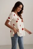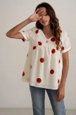 With a ivory base and oversized rusty red polka dots – this blouse is no doubt fall ready! Simple ruching and embroidered details are the final touches to this stunning top.