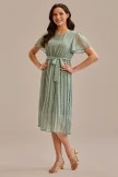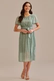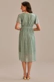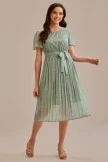 The Light Olive Leaf Print Pleated Waist Tie Midi Dress features short flounce sleeves, a back button closure, an elastic waist, a pleated skirt, and a waist tie. The dress falls to a modest midi length, making it appropriate for any occasion!