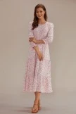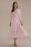 Add an on trend smocked floral midi dress to your closet. With a round neck, long sleeves and a tiered midi skirt. Pair with black heels for polished occasion look or with knee high boots to beat the cold weather.Â