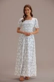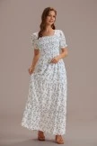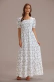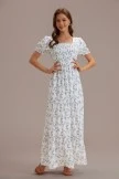 Pretty maxi dress featured in a pretty floral print with a square neckline, ruffled detailing, gathered elastic bodice and waist, and flowy tiered skirt.