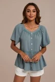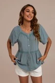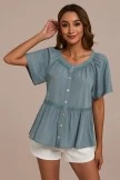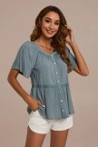 This is a stylish peplum top that features a square neckline with lace trim, functional buttons up front,a lace trim with slight peplum style for an updated look, while the short sleeves complete the look.