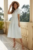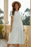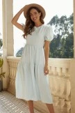 This midi-length dress is made from a lightweight, flowy material and comes in a light blue color. The short puff sleeves compliment the tiered details in the skirt. There is a round neckline and an hidden zipper on the back for the perfect finishing touch.This dress is maternity-friendly because of its flowy skirt piece