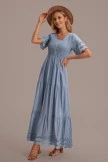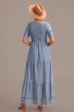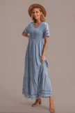 The Dress has formfitting smocking around the body that stretches + shrinks to fit every body type! The dress flows into a beautiful tiered skirt and has the prettiest cutout detailing on the hem + sleeves. This dress also features faux buttons, a full lining in the skirt, and a cap lining in the sleeve.