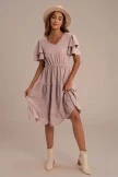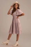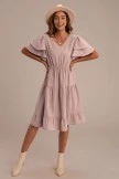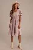 The Swiss Dot Dress is a summer beauty. It has tiered + ruffled short sleeves. The swiss dot print adds classic detailing + the elastic waistline adds a comfortable fit. It has a ruffled hemline.