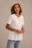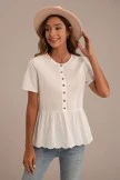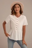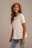 This top is a lightweight, breathable blouse with a peplum hem and functional buttons. A soft, cotton fabric makes it easy to wear in any season. This top pairs well with light denim or your favorite pair of shorts in the warmer months. Keep your look versatile by wearing this layering piece under cardigans and sweaters when the weather cools down.