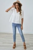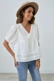 Loos fit, V-neck, short puff sleeves with elastic cuff, Embroidery, Hollow Out, Tiered Layer. 100% cotton, soft and comfy material, fabric has no stretch, suit for daily wear, casual, work and so on.
