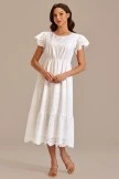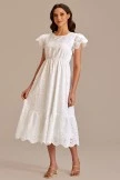 We keep falling for this beautifully detailed eyelet midi dress! This modest, white dress is designed with a round neck, short scalloped sleeves, elastic waist with stretch, a single tiered midi skirt.