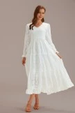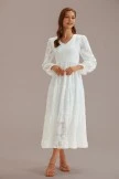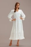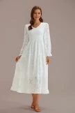 Absolutely stunning textured floral fabric in a pure white color with a V-neck smocked stretchy bodice, elastic stretchy waistband, long sleeves.