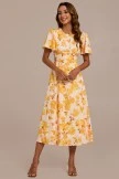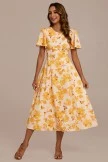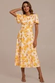 This dress uses yellow florals. The neckline is designed with a round collar and there is a button behind the neckline. The dress has pleats at the back waist and is elastic.